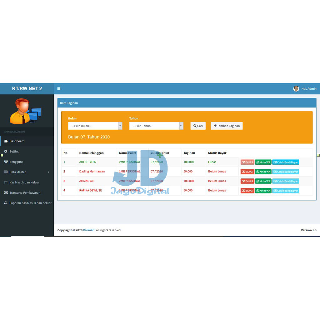 Aplikasi tagihan internet rt rw Berbasis Web Dengan PHP, MySQLI dan Bootstrap , aplikasi ini bisa diaplikasikan untuk usaha internet anda supaya tercatat dengan baik, beberapa fitur yang ada Sebagai berikut :